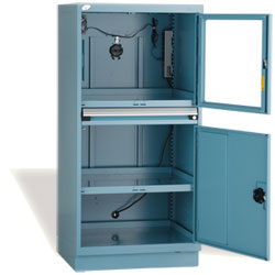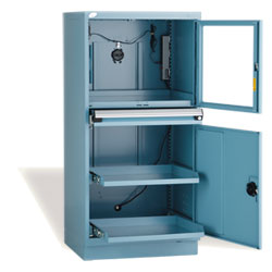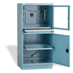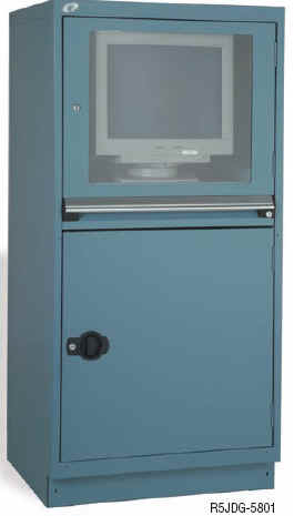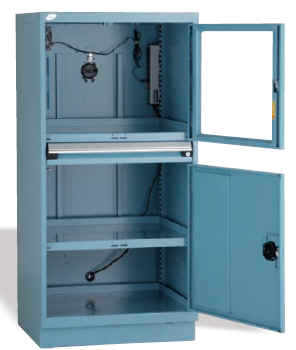 Features: Base: 4" base designed for moving the cabinet from the front with a forklift or a pallet-jack. Its straight angle front cover plate facilitates floor cleaning Shelves: Shelf adjustable every 1" c/c Roll Out Shelves: 2 roll-out shelf to facilitate access to printer and computer Components: