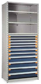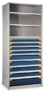 (2)ea - 3" drawers @ 30 compartments/ea (3)ea - 4" drawers @ 30 compartments/ea (2)ea - 6" drawers @ 12 compartments/ea (1)ea Roll-Out Front Access Shelf |